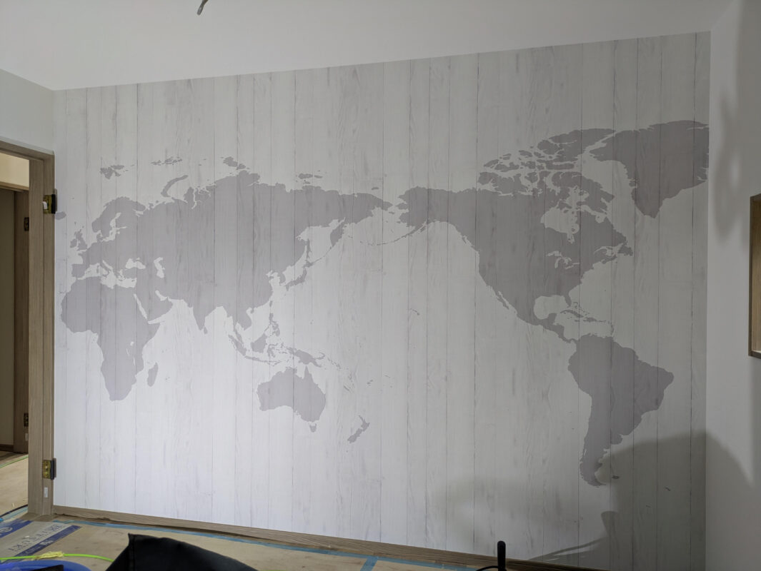 子供部屋のアクセントクロスは、本人が選んだ地球儀模様。